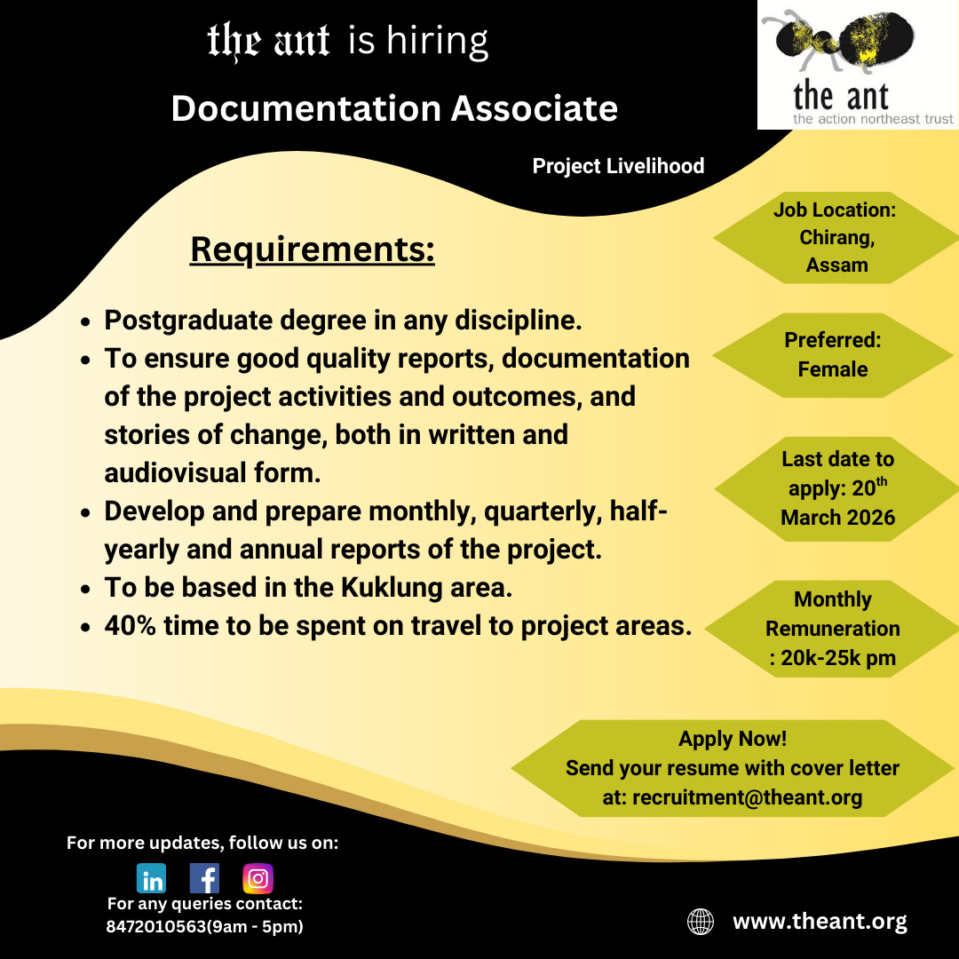 Please send an email to recruitment@theant.org with the subject line Application for the post of Documentation Associate with cover letter and updated CV by 20th March 2026. Only shortlisted candidates will be contacted for an interview.